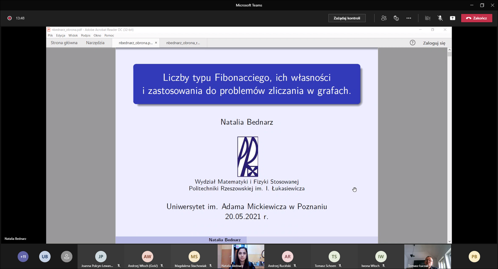W dniu 20 maja 2021 r. na Wydziale Matematyki i Informatyki Uniwersytetu Adama Mickiewicza w Poznaniu odbyła się publiczna obrona rozprawy doktorskiej mgr Natalii Bednarz, która jest pracownikiem Zakładu Matematyki Dyskretnej. Obrona odbyła się zdalnie przy użyciu środków komunikacji elektronicznej (platforma Microsoft Teams). Komisja doktorska jednomyślnie przyjęła rozprawę pod tytułem: Liczby typu Fibonacciego, ich własności i zastosowania do problemów zliczania w grafach.