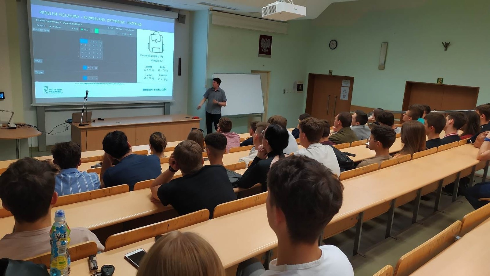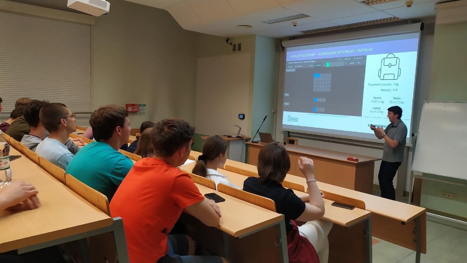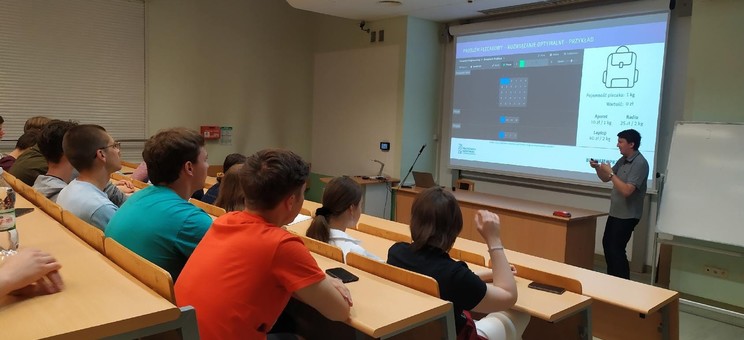 W dniu 03.06.2022 w cyklu wykładów otwartych WMiFS uczniowie IV LO w Rzeszowie mieli okazję zagłębić się w zagadnienia związane z optymalizacją dyskretną. Wykład "Jak efektywnie robić zakupy - optymalizacja dyskretna w praktyce" wygłosił pracownik naszego Zakładu dr Paweł Bednarz. Zaprezentowane w nim zostały praktyczne zastosowania problemów: plecakowego oraz pokrycia zbioru. Uczniowie mieli możliwość wzięcia aktywnego udziału w rozwiązywaniu postawionych zagadnień.